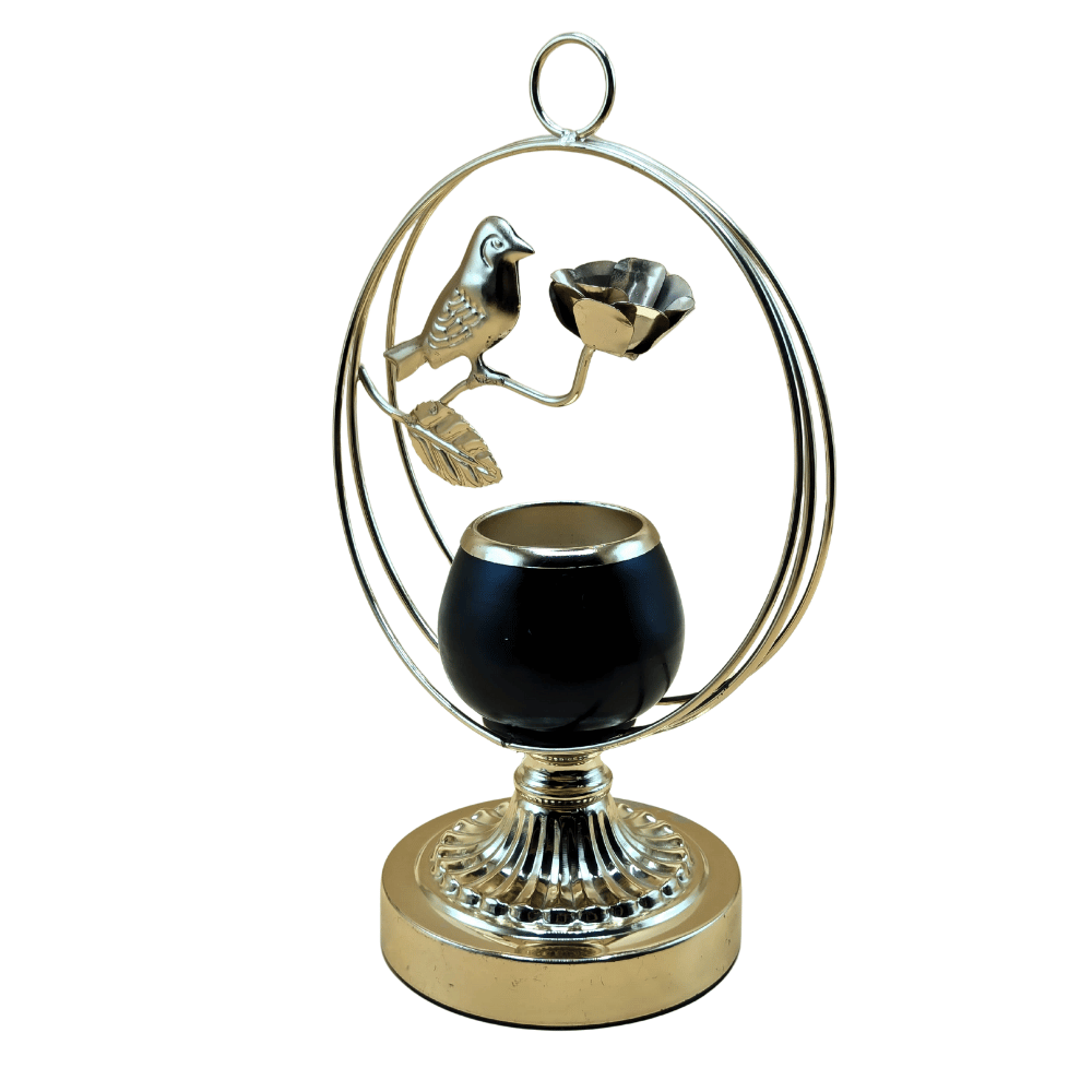 This exquisite golden candle holder features a gracefully perched sparrow on a branch alongside a delicate rose, all within a elegant circular frame. Crafted from polished metal with a contrasting black inner cup for holding a candle, this piece serves as a charming and sophisticated decorative accent for any home or office. It makes a perfect gift for bird lovers, nature enthusiasts, or anyone who appreciates unique and artistic home decor.