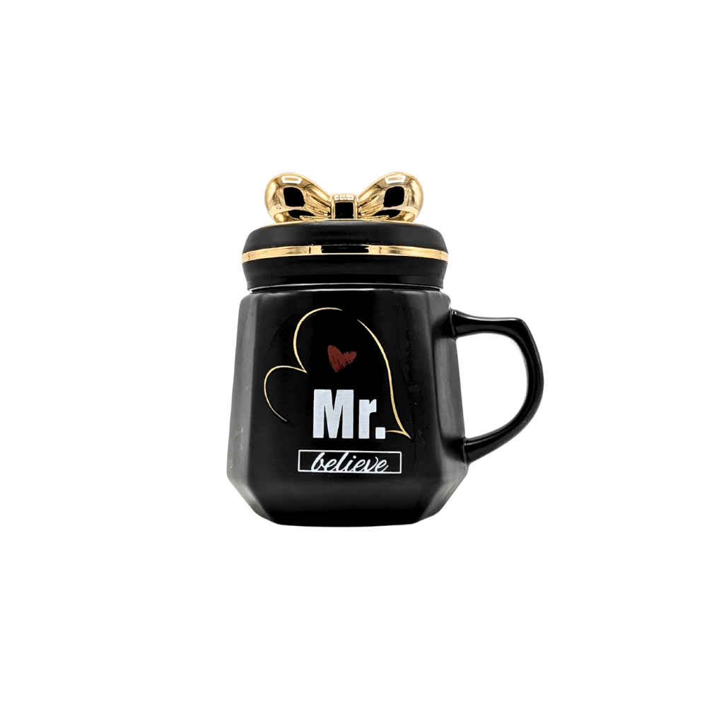 This elegant black ceramic mug features a unique design with "Mr. believe" text and a subtle heart detail on the front. It is topped with a stylish black lid adorned with a prominent golden bow, adding a touch of sophistication. The mug's design suggests it is an ideal gift, particularly for a male recipient or as part of a couple's set, often associated with themes like Valentine's Day or anniversaries. The ceramic material ensures durability, while the lid helps maintain beverage temperature.