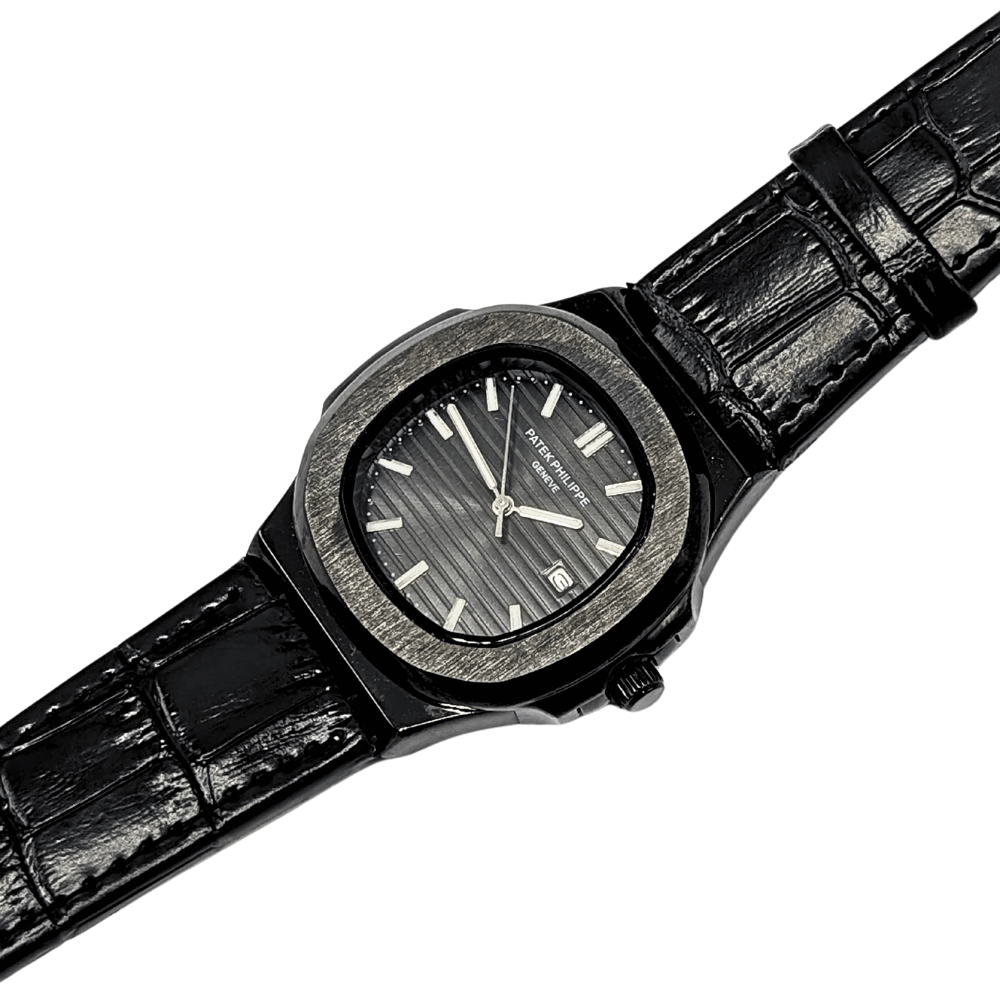 Experience the iconic Patek Philippe Nautilus, a masterpiece of horological design featuring a striking black dial and a luxurious alligator strap. This exquisite timepiece boasts a classic design, a secure closure for comfortable wear, and a functional date display, embodying sophistication and precision.