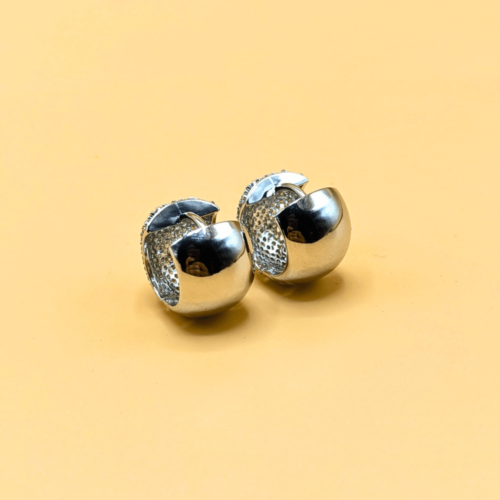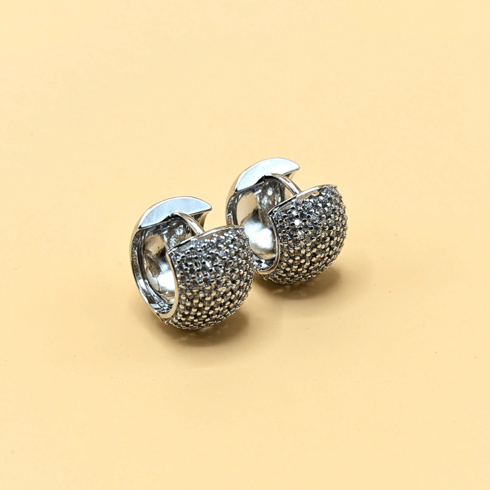 These elegant huggie hoop earrings feature a dazzling pave setting of clear crystals, offering a sophisticated sparkle. Crafted in a polished silver-tone metal, their compact design provides a comfortable and secure fit, making them a versatile accessory for both everyday wear and special occasions.