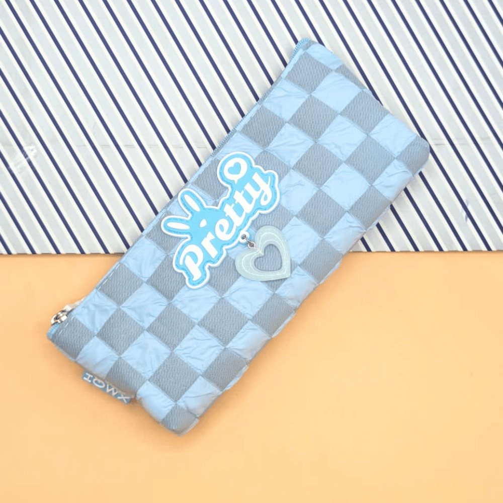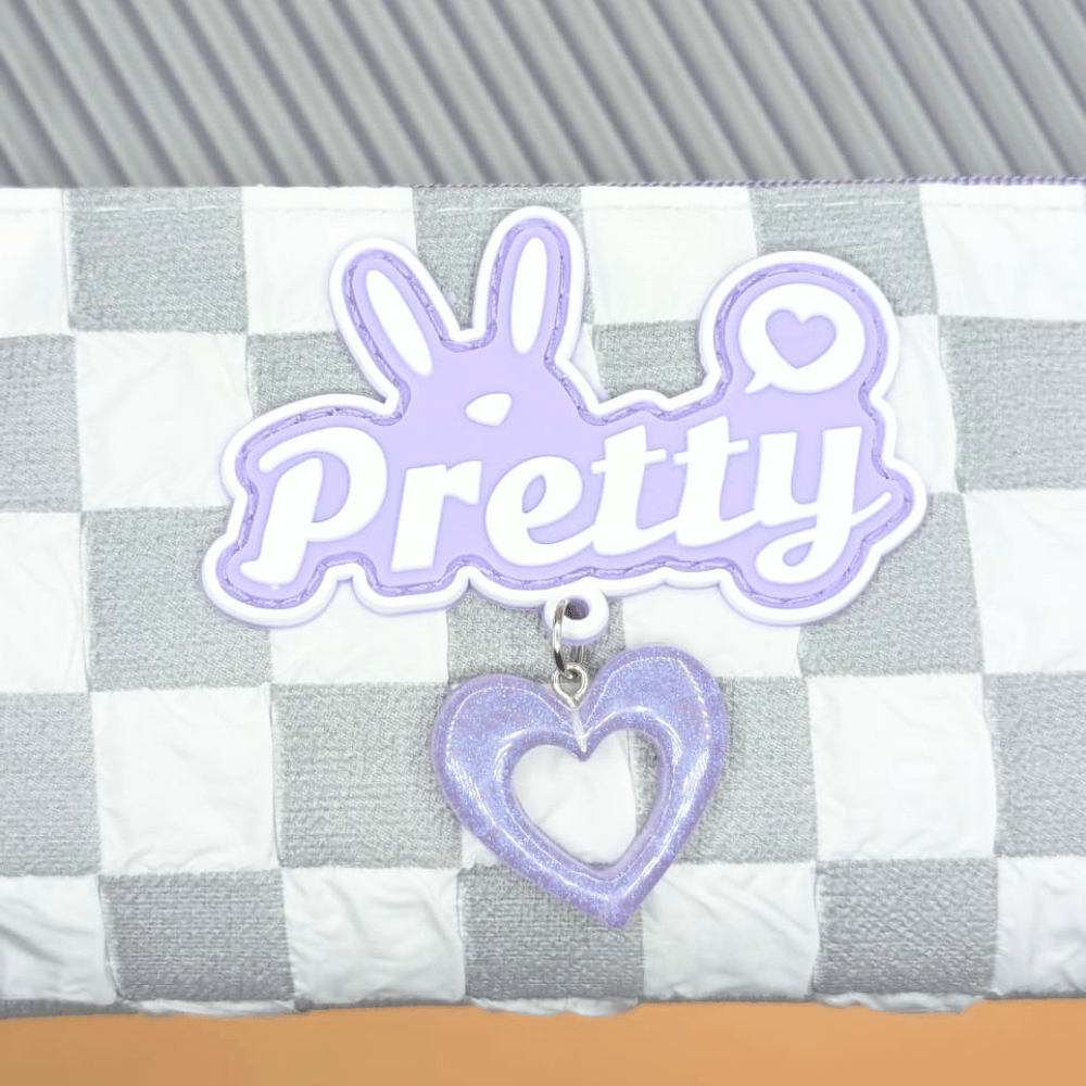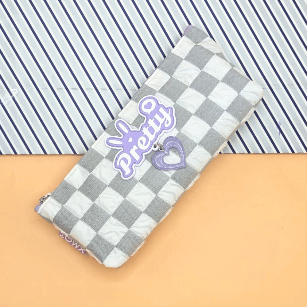 This charming pencil pouch features a stylish grey and white checkered pattern, perfect for adding a touch of flair to your stationery collection. Adorned with a playful "Pretty" charm and a sweet heart embellishment, it's ideal for organizing your pens, pencils, and other small essentials with a dash of personality.