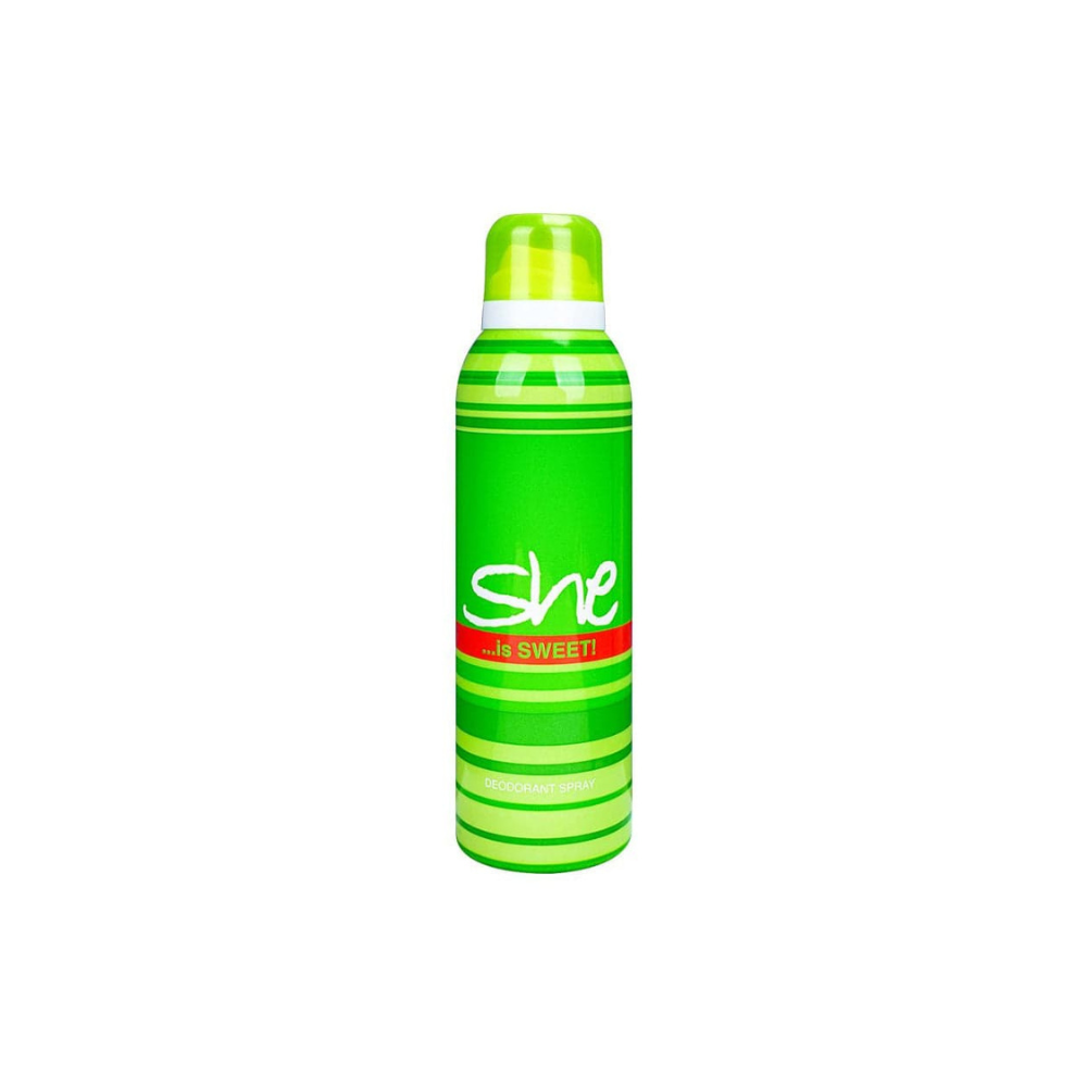 The image shows a green can of She Deodorant Spray, specifically the "Is Sweet" variant. The can features a striped pattern and the brand name "She" in a stylized font. The text "...is SWEET!" is prominently displayed, indicating the fragrance's sweet scent. Below that, "DEODORANT SPRAY" is written. This product is a popular choice for those seeking a light, sweet fragrance for daily use. It is available in various sizes, including 150ml and 200ml. The spray is designed to leave a refreshing and long-lasting scent.