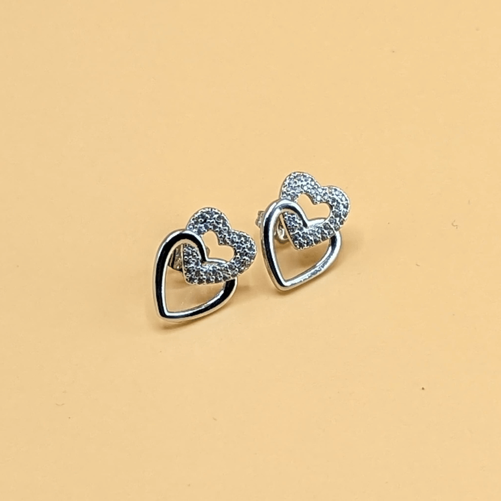 These elegant stud earrings feature a captivating design of two interlocking hearts, one adorned with sparkling cubic zirconia stones and the other a polished silver outline. Crafted from sterling silver, they symbolize connection and affection, making them a perfect gift for a loved one or a charming addition to any jewelry collection. The secure butterfly backing ensures comfortable and reliable wear.