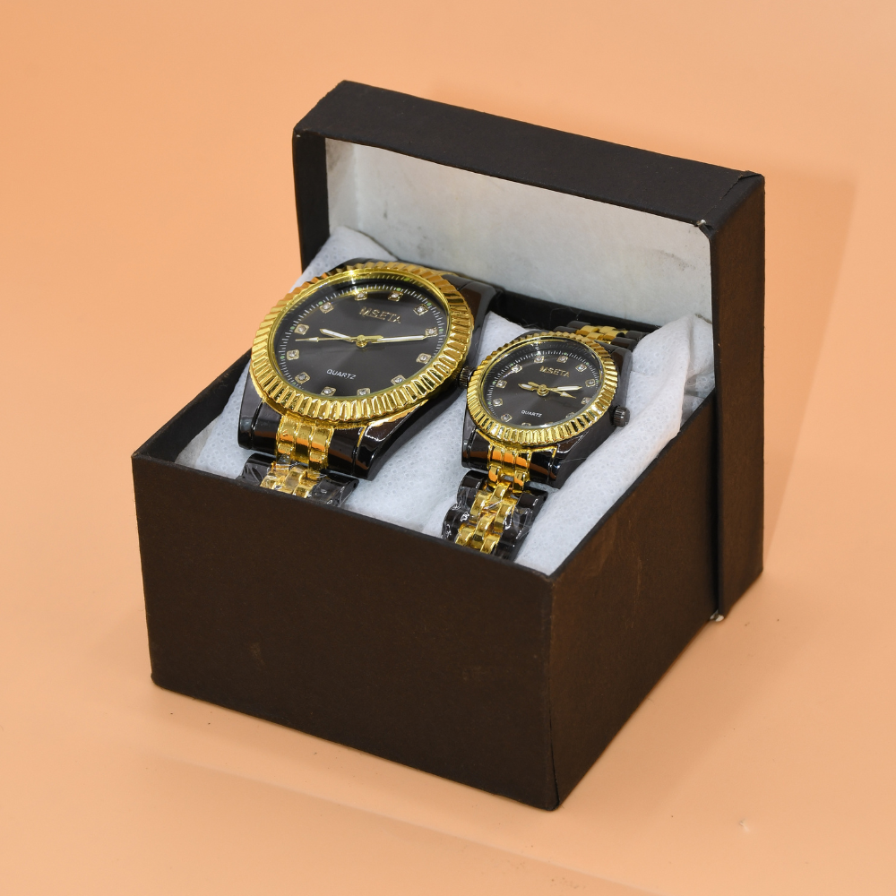 This elegant couple watch set features a classic design with gold accents and a sleek black band. It's perfect for couples who want to celebrate their bond with a timeless accessory. The set includes a larger watch for him and a slightly smaller one for her, both showcasing the same sophisticated style. These watches can be worn for both casual and formal occasions.
